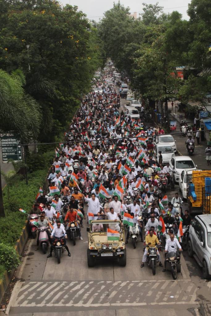 नवी मुंबई (पालिका प्रशासन) : स्वातंत्र्याच्या अमृत महोत्सवानिमित्त हर घर तिरंगा अभियानांतर्गत आज ऐरोली विधानसभा क्षेत्रामध्ये लोकनेते आमदार गणेश नाईक यांच्या नेतृत्वाखाली तसेच नवी मुंबई भाजपा जिल्हाध्यक्ष संदीप नाईक यांच्या मार्गदर्शनाखाली नवी मुंबई भाजपाच्या वतीने भव्य तिरंगा बाईक रॅली काढण्यात आली. या रॅलीमध्ये हजारो देशप्रेमी नागरिकांचा उत्स्फूर्त सहभाग लाभला.
