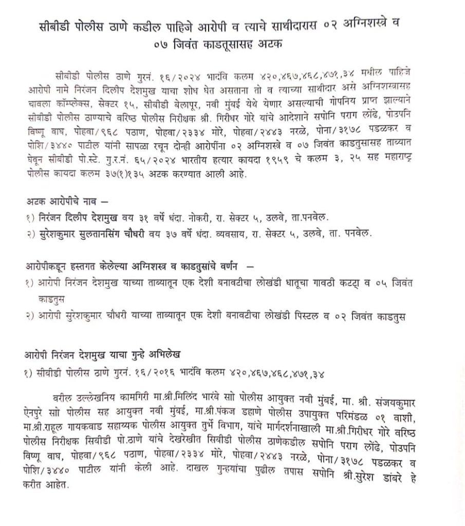 on सीबीडी पोलिसांकडून अग्निशस्त्रे व जिवंत काडतुसांसह दोन जणांना अटक