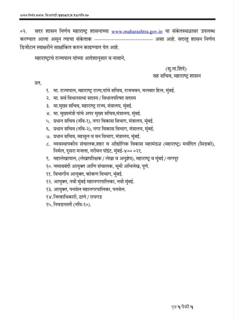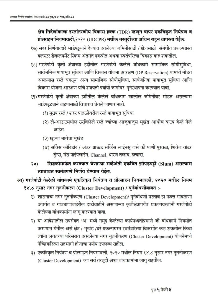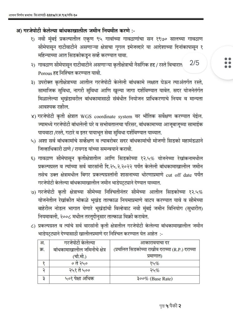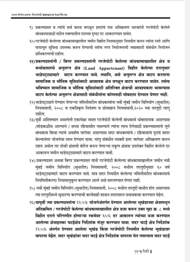 महाराष्ट्र शासनाच्या नगर विकास विभागाने शासन निर्णय क्रमांक सिआयडी – 3317/प्र.क्र.94/नवि-10 नुसार गरजेपोटी केलेली बांधकामे नियमित करत असल्याचा आदेश काढला आहे. या शासन निर्णयानुसार 25 फेब्रुवारी 2022 पर्यंतची प्रकल्पग्रस्तांनी गरजेपोटी केलेली बांधकामे नियमित झाली आहेत.