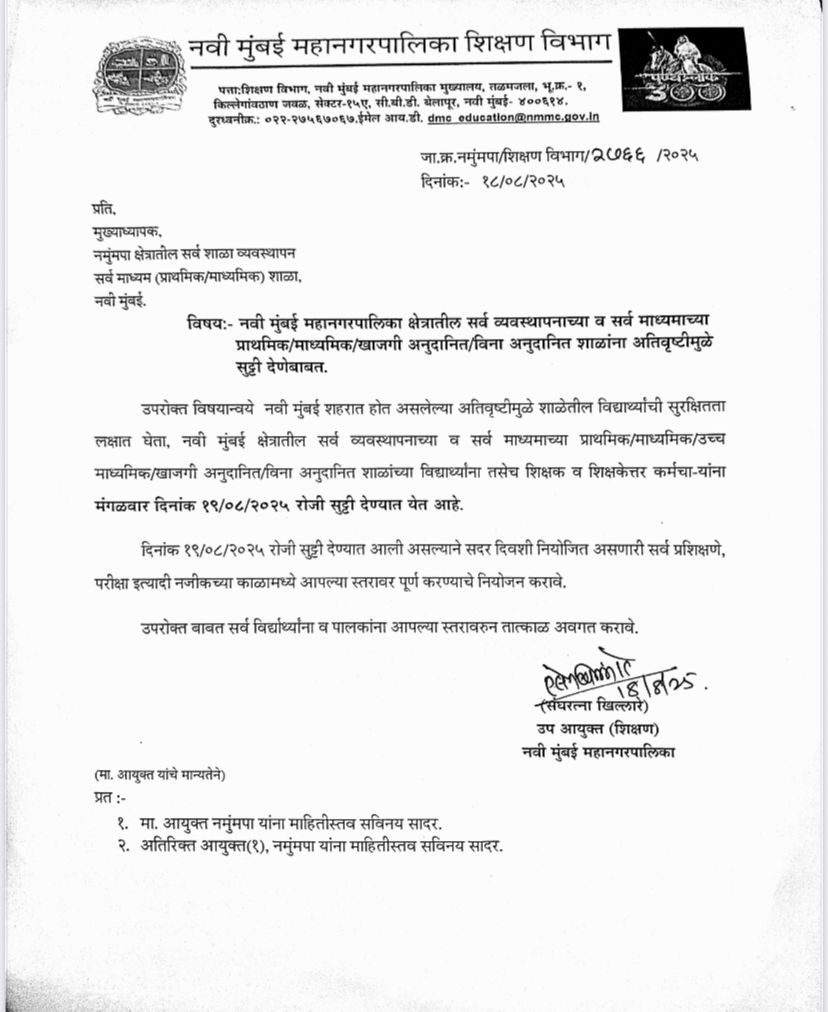 पालिका प्रशासन: भारतीय हवामान खात्याने महाराष्ट्रात दिलेल्या अतिवृष्टीच्या इशाऱ्याच्या पार्श्वभूमीवर, नवी मुंबई महानगरपालिका क्षेत्रातील सर्व प्रकारच्या शाळा आणि विद्यालयांना उद्या, 19 ऑगस्ट 2025 रोजी सुट्टी जाहीर करण्यात आली आहे. विद्यार्थ्यांच्या सुरक्षिततेला प्राधान्य देत नवी मुंबई महानगरपालिकेच्या शिक्षण उपायुक्तांनी यासंदर्भात एक पत्र जारी केले आहे.